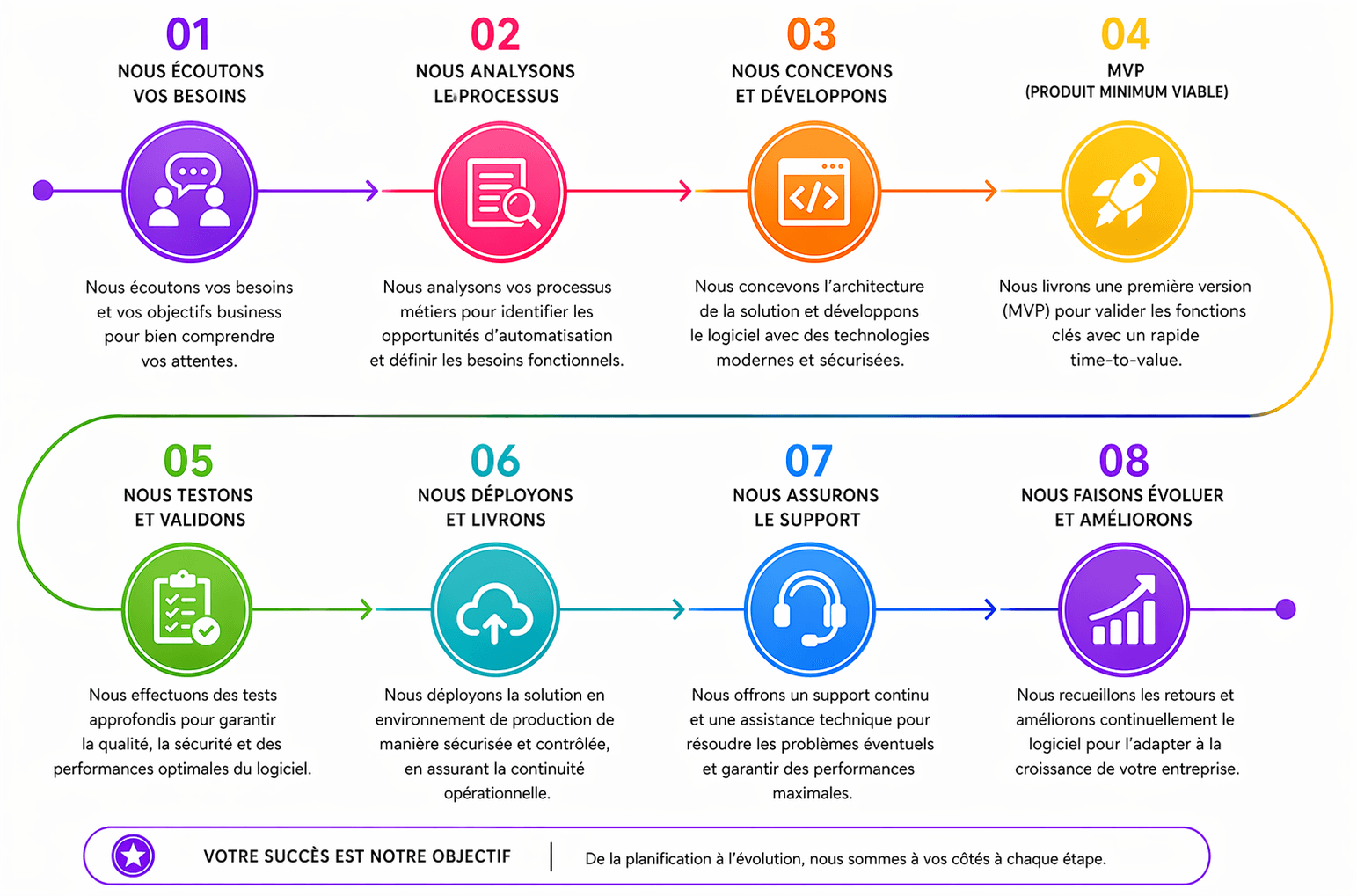 - Notre approche repose sur un principe simple : éliminer les tâches manuelles et les transformer en processus automatisés, intelligents et évolutifs.